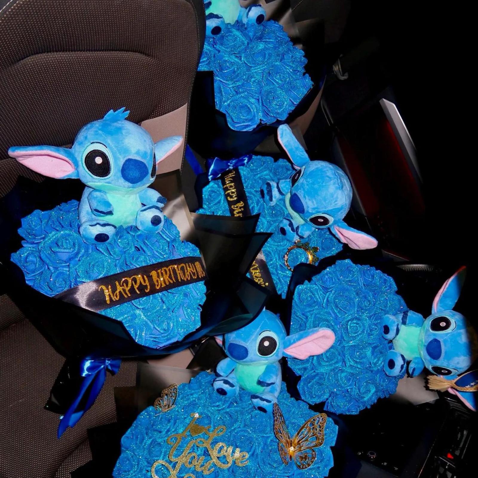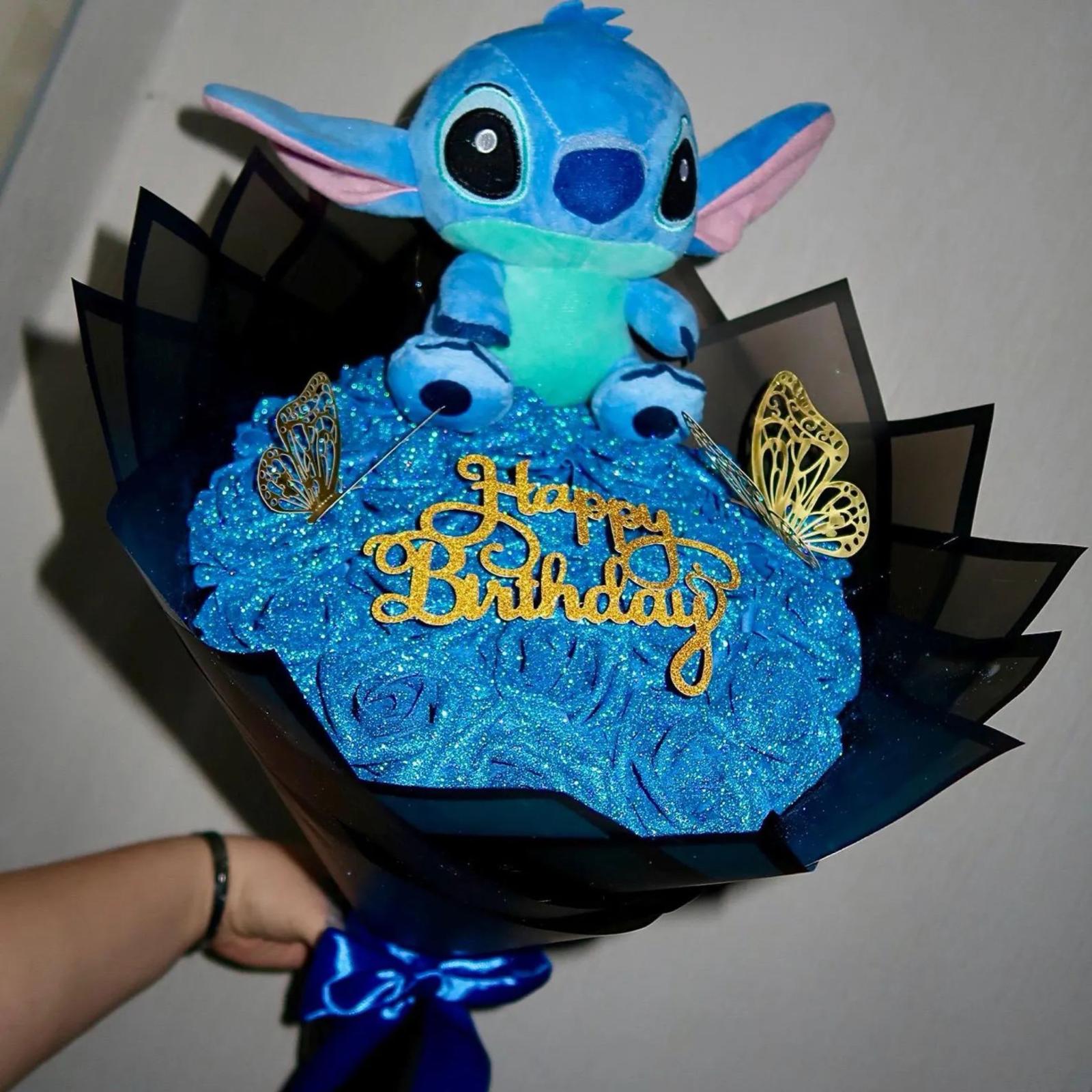 Un bouquet unique, confectionné à la main, aux délicates nuances de rose rehaussées de subtiles paillettes, accompagné d'une adorable peluche ange Disney. Emballé dans un élégant papier cadeau aux accents dorés, c'est le cadeau idéal pour les occasions spéciales comme les anniversaires, la Saint-Valentin ou un anniversaire de mariage